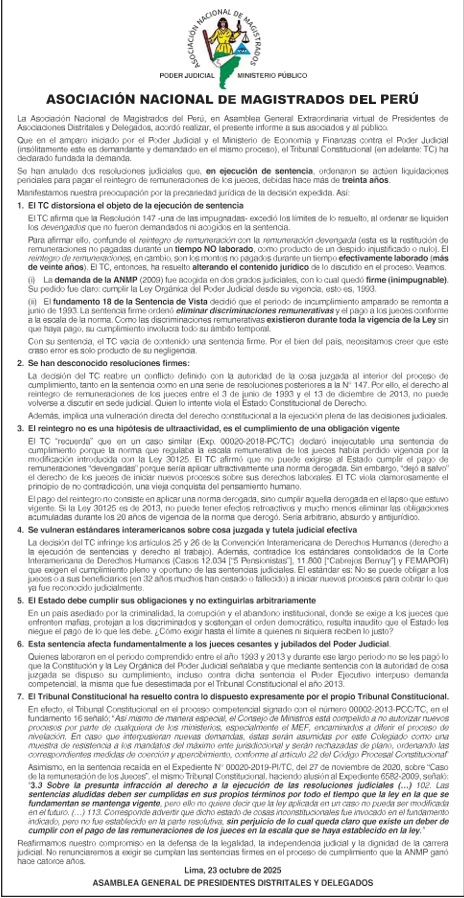 PRIMERO: RECHAZAR toda acción que signifique un atentado contra la Independencia del Poder Judicial del Perú y de los magistrados, invocando y exhortando al Congreso de la República, al Poder Ejecutivo, el respeto a los Principios de Separación y Equilibrio de Poderes.